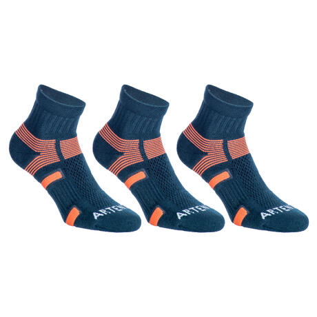 Meias espessas estudadas para o desporto, 1 fio elástico em todo o pé para um excelente apoio, malha turca arejada para um maior conforto. Vendidas em conjuntos de 3 pares.