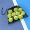o praticante de ténis à procura de um ARMAZENAMENTO e um TRANSPORTE das bolas de ténis.