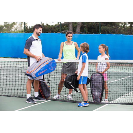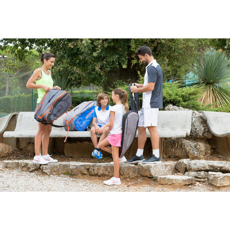 Este saco para desportos de raquete pode conter até 3 raquetes de ténis (adultos ou crianças).Contém um bolso com fecho em malha de rede no interior, uma alça para transporte e uma pega.