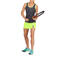 A bola de ténis coloca-se entre o shorty integrado e a perna da praticante.